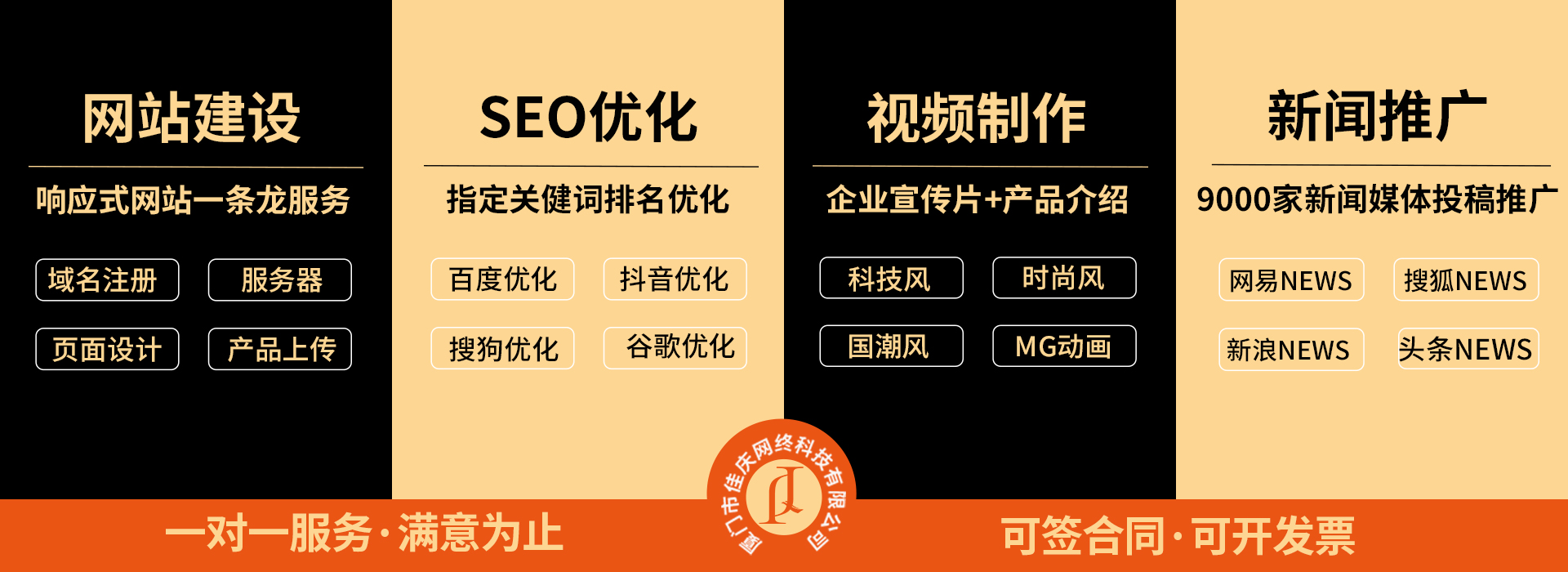 H5響應式網(wǎng)站搭建設計.外貿網(wǎng)站制多.站群推廣.百度谷歌SEO優(yōu)化推廣.媒體新聞投稿.小程序公眾號開發(fā).視頻宣傳片制作.企業(yè)郵箱滿足不同行業(yè)客戶的各種需求
